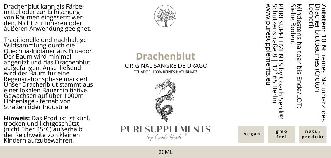 Im Gegensatz zu herkömmlichem Drachenblut, das häufig aus peruanischen Baumplantagen stammt und mit Alkohol oder Wasser verdünnt wird, ist Puresupplements Drachenblut naturrein und entspricht der Qualität, die die Indios seit Generationen selbst verwenden. Der Baum wird minimal angeritzt, um das Drachenblut aufzufangen, und anschließend wird der Baum für eine Regenerationsphase markiert, um eine nachhaltige Ernte zu gewährleisten.