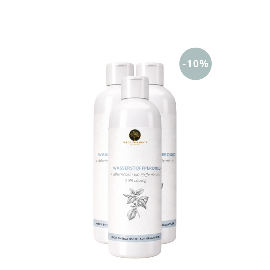 Dieses Produkt ist eine 3,5%ige Wasserstoffperoxid-Lösung mit zugesetztem ätherischem Bio Pfefferminzöl.