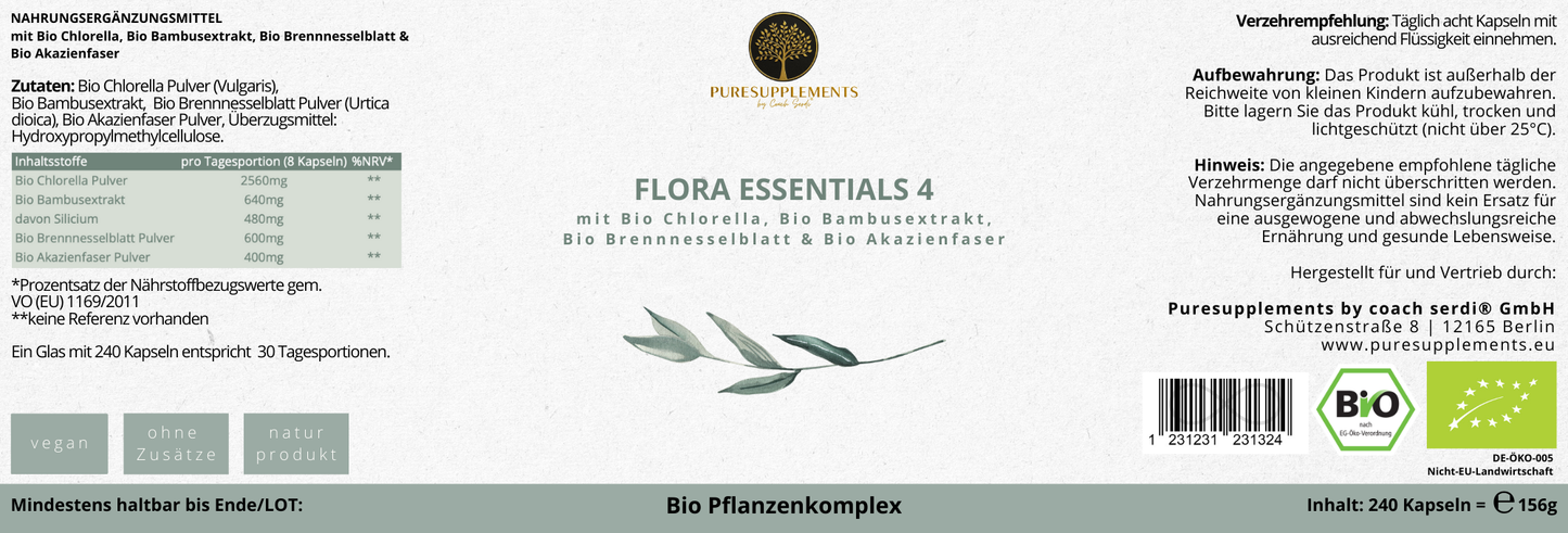 Bio Flora Essentials 4 | Bio Chlorella | Bio Bambusextrakt - 75% Silizium | Bio Brennnesselblatt | Bio Akazienfaser | XL Pack | 240 Kapseln