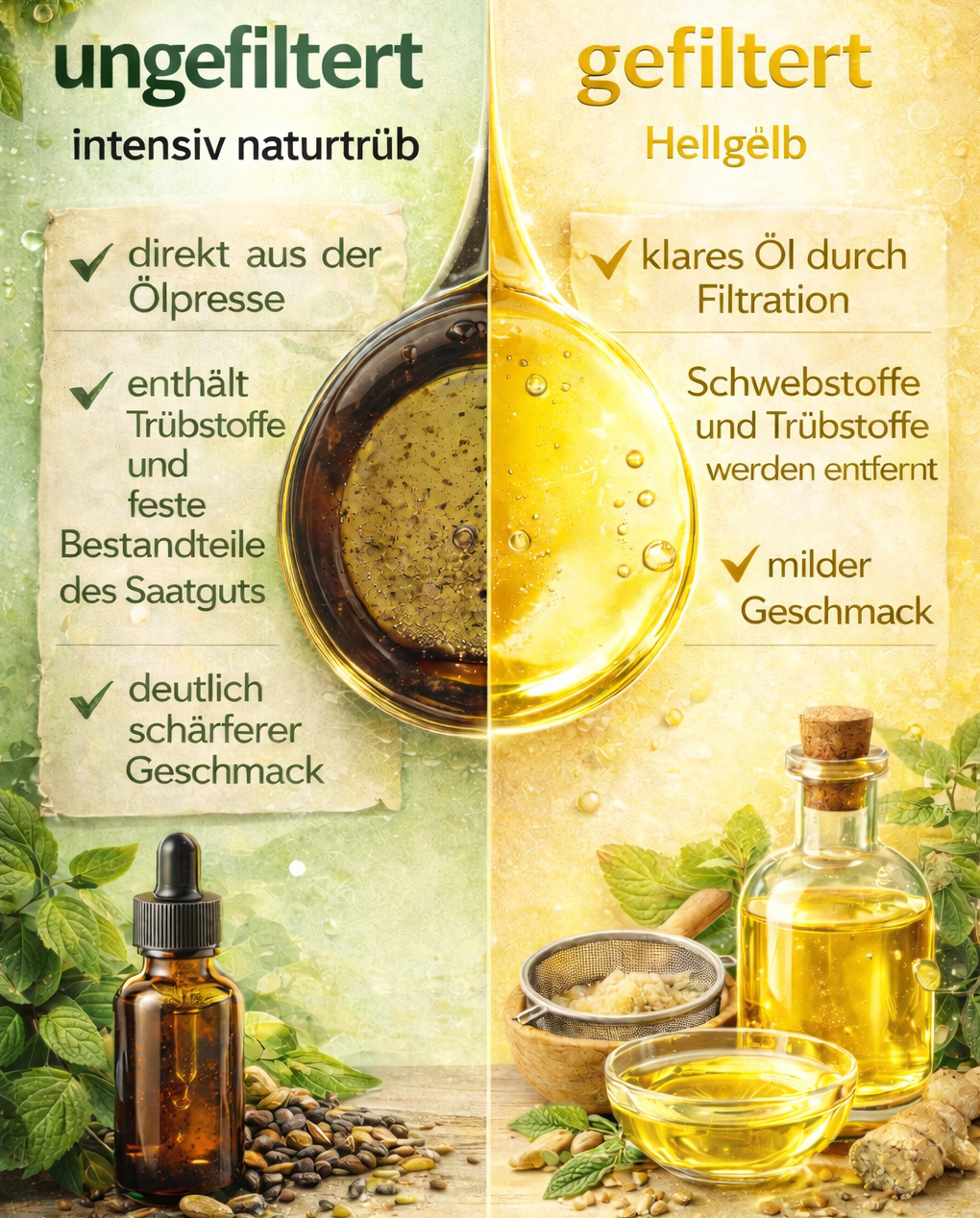 Durch den bewussten Verzicht auf Filtration bleibt das Öl naturtrüb und enthält seine typischen Trüb- und Schwebstoffe. Diese prägen das intensive Aroma und den markanten, leicht würzigen Geschmack.