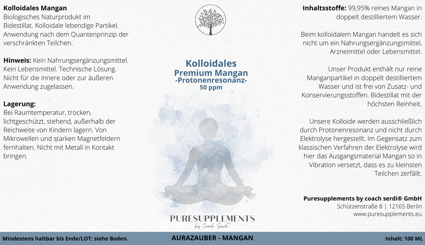 Kolloide sind keine Nahrungsergänzungsmittel nach EU-Bestimmungen.Beim kolloidalem Mangan handelt es sich nicht um ein Nahrungsergänzungsmittel, Arzneimittel oder Lebensmittel. Technische Lösung. Nicht für die innere oder zur äußeren Anwendung zugelassen.