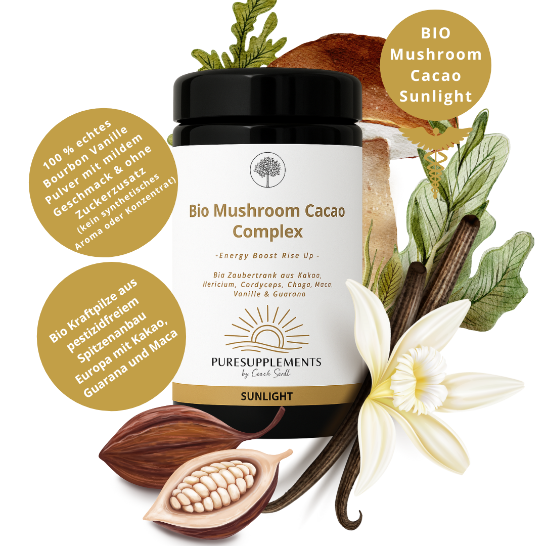 Bio Mushroom Kakao Komplex -Sunlight- (Synergetikum Energy Boost, Bio Premium Rohkostqualität, Kraftpilze Hericium, Chaga & Cordyceps EU-Anbau, Kakao Pulver, Maca Pulver & Guarana Pulver mit echtem Vanille Pulver, 100g, Mironglas)