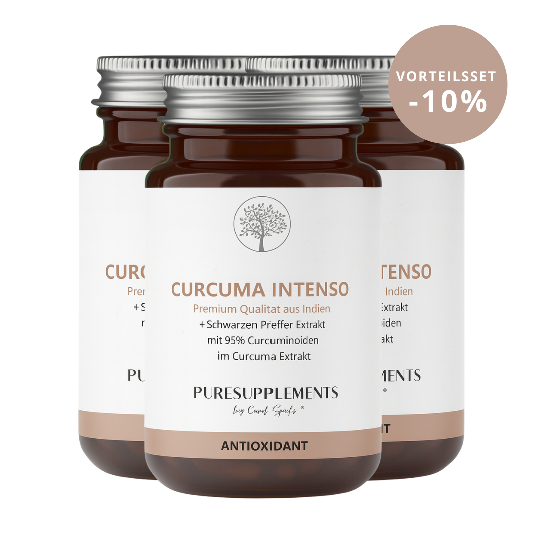 Unser Curcumin Komplex Intenso, hergestellt aus naturbelassenem indischen Curcuma-Wurzelpulver und -extrakt, bietet eine 40-fach höhere Bioverfügbarkeit der wertvollen Curcuminoide in Kombination mit Piperin aus schwarzem Pfeffer.