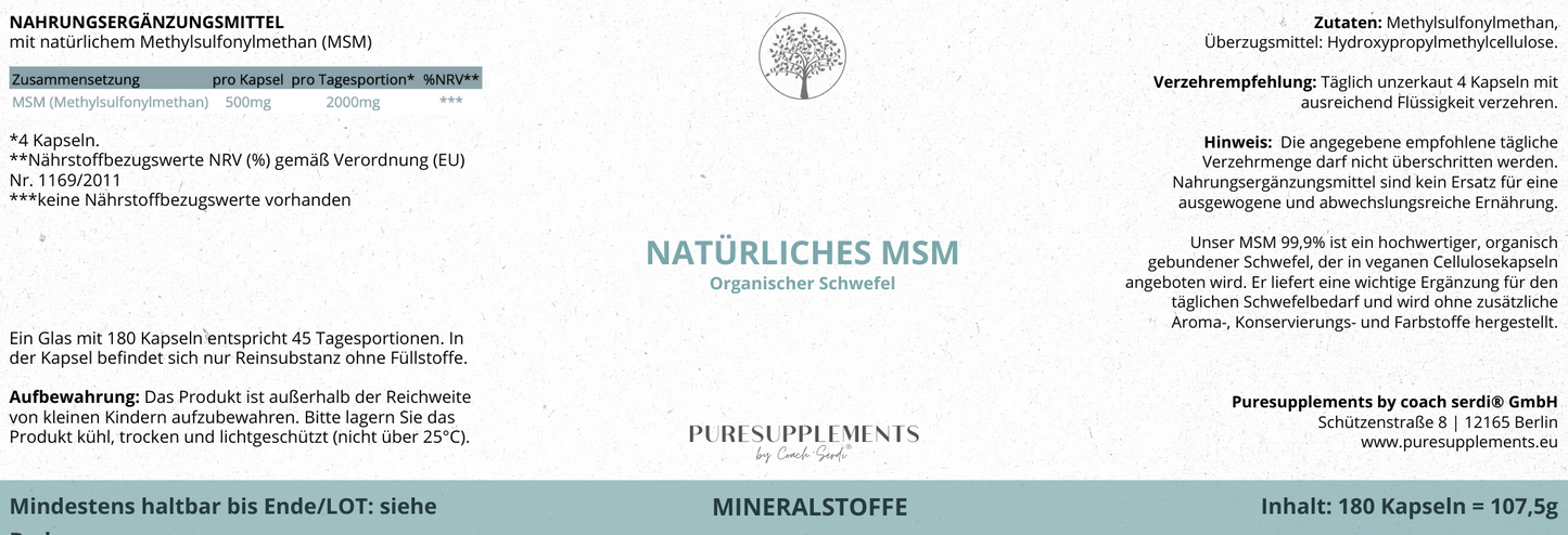 Unser MSM (Methylsulfonylmethan) ist zu 100% natürlich und rein und erfüllt höchste Qualitätsstandards. MSM ist organischer Schwefel und wird aus erstklassigen Rohstoffen hergestellt, was eine hohe Produktsicherheit sowie Verträglichkeit garantiert. Viele Hersteller bieten minderwertige Billigprodukte an, die aus minderwertigen Rohstoffen hergestellt werden. Unser MSM wird durch ein spezielles Destillationsverfahren gewonnen, welches eine hohe Qualität, Bioverfügbarkeit und Reinheit sicherstellt.
