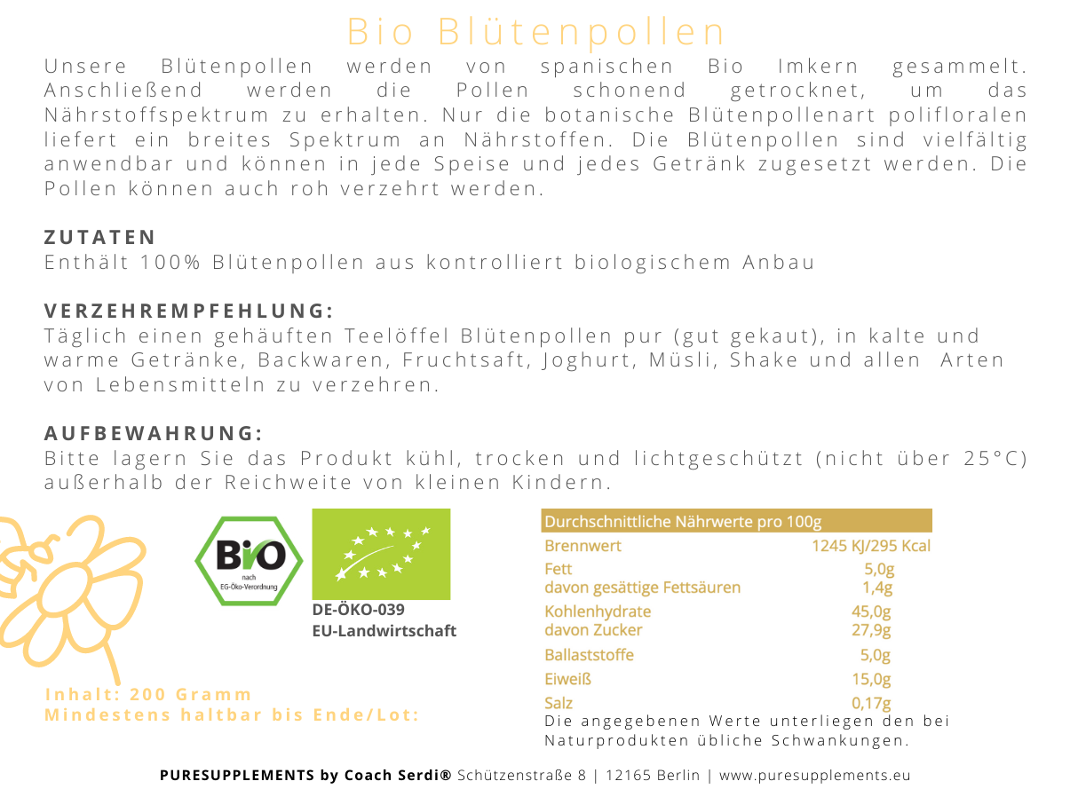 Bio Blütenpollen Rohkost aus Spitzenanbau Spanien (Bio Imkerei, Zuckeralternative, Vegan, 200g)