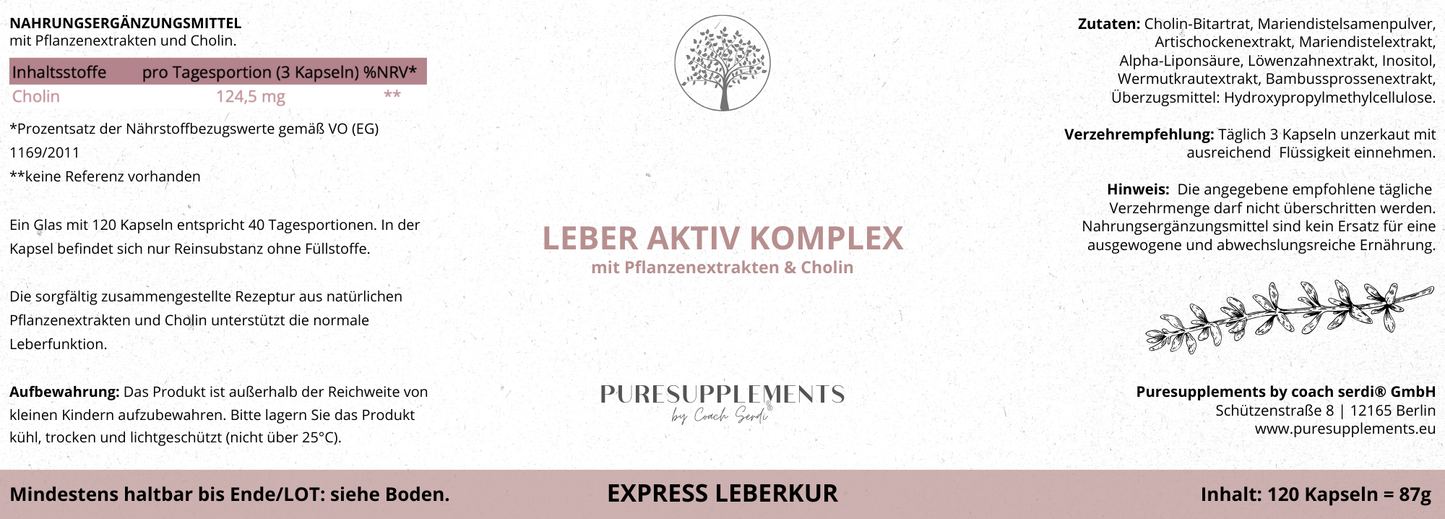 Express Leberkur Komplex aus Pflanzenextrakten mit Cholin (Leber Aktiv, Mariendistelsamen, Artischockenextrakt, Löwenzahnextrakt, Wermutkrautextrakt, Bambussprossenextrakt, 120 Kapseln)