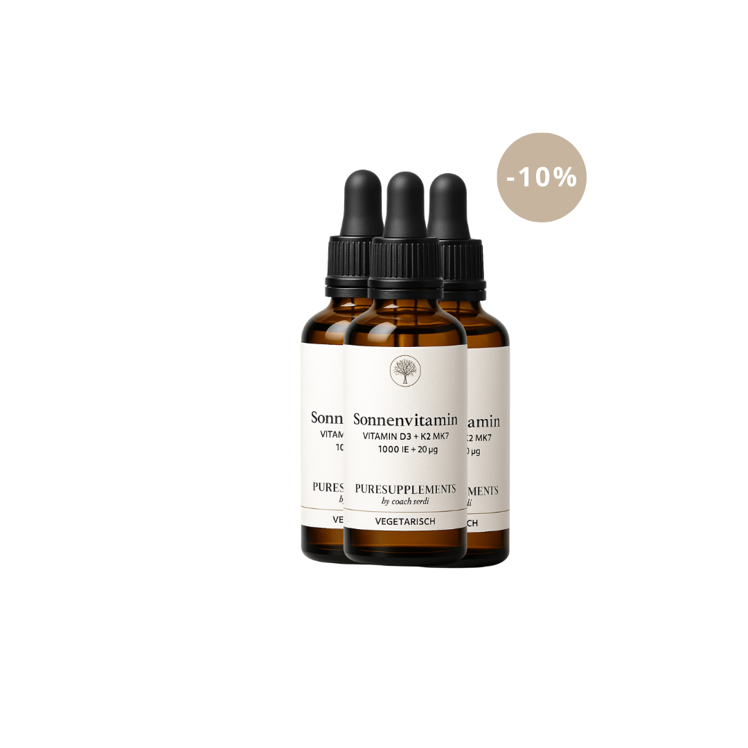Hochwertige Kombination aus Vitamin D3 (Cholecalciferol) aus Lanolin und Vitamin K2 (MK-7 All-Trans-Form), gelöst in MCT-Öl auf Kokosbasis.